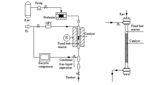 專用催化劑裝填在反應器內(nèi),經(jīng)過活化和預處理后,高壓泵打入原料,氫氣一直保持連續(xù)進出,并過量,原料液經(jīng)過催化劑床層進行加氫反應生成產(chǎn)物,然后經(jīng)過電磁閥排出,整個反應過程一直保持原料液的連續(xù)進入和產(chǎn)物的連續(xù)排出。